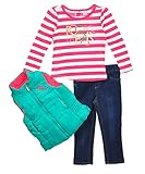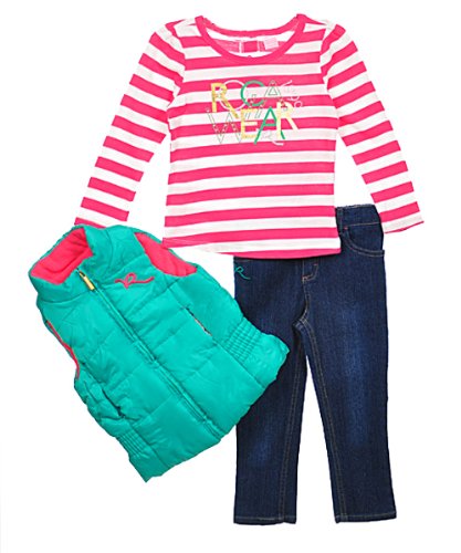 This Rocawear outfit offers your little girl a smart and sporty look. All items are made of soft fabrics for her comfort. Includes: Vest: full zip, bubble insulation, "R" embroidery, elastic waistband, fleece interior. (100% Polyester) L/S T-Shirt: stripe print, glam text logo graphic with glitter accents, easy-change snaps in back. (60% Cotton, 40% Polyester) Jeans: elastic waistband, logo button, "R" embroidery on front pocket, split text logo embroidery on back pockets. (93% Cotton, 6% Polyester, 1% Spandex) Machine Wash Cold Made in China