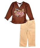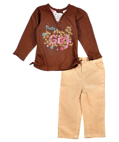Give her a fun and frilly look with this Young Hearts outfit! The jersey top features buttons in the back, cinch accents on the side seams, ruffled cuffs, lace trim at the neck, and a "Pretty Girl" design with embroidered highlights. The matching corduroys have an elastic waistband, front pockets, and a button closure. Both Items 100% Cotton Machine Wash Cold, Inside Out Made in Bangladesh