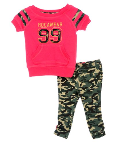 This Rocawear set strikes just the right balance between sweet and sassy style. The French terry sweatshirt features a kangaroo pocket, cap sleeves, and thick ribbed trim at the cuffs and hem. Glam accents include camouflage print trim, metallic logos, and an embroidered "99" patch. The matching leggings have an allover camouflage print and ruching at the hem. 58% Cotton, 38% Polyester, 4% Spandex Machine Wash Cold, Inside Out Made in China