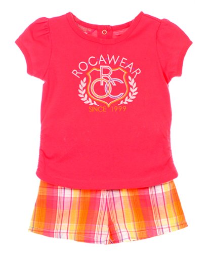 She'll be ready for summertime fun in this adorable set from Rocawear! The soft top features knit trim, easy-change snaps in the back, ruching at the sides, and a glittery printed logo. The matching plaid shorts have a stitched button fly, elastic waist, and front scoop pockets. Too cute! 60% Cotton, 40% Polyester Machine Wash Cold, Inside Out Made in Thailand